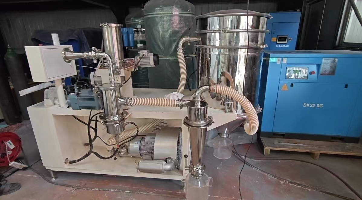 ? ? ? ? ? ? ? ? 因客戶帶的樣品較少的原因,我們采取將物料直接導(dǎo)入磨腔中,無(wú)需經(jīng)過(guò)喂料絞龍,通過(guò)氣流粉碎機(jī),我們成功地? ?將二氧化硅粉碎至15微米,達(dá)到了客戶的要求。在粉碎過(guò)程中,我們調(diào)整了研磨氣壓力和分級(jí)頻率,以確保樣品的粒度達(dá)到目標(biāo)值。通過(guò)粒度分析儀的測(cè)量,我們可以確定樣品的平均粒度,并保證其符合要求。此外,我們還使用真空干燥箱去除了樣品中的吸附水分,以確保實(shí)驗(yàn)結(jié)果的準(zhǔn)確性。